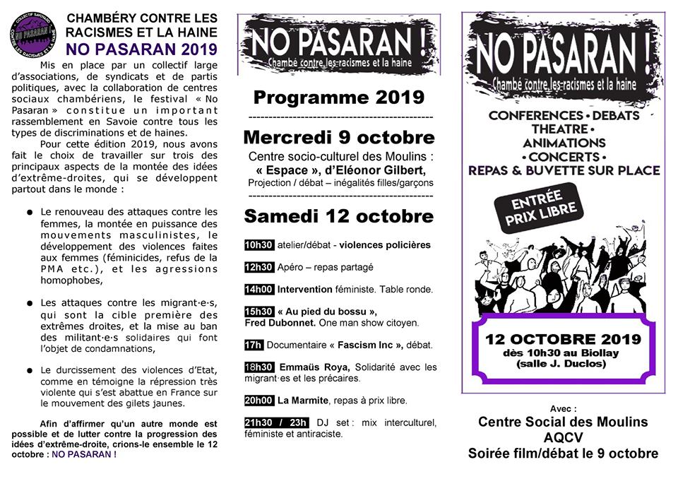 Actualités Sociales Evénements News Non classé No Pasaran – 12.10 au Biollay 8 octobre 20198 octobre 2019 AdminCgt Journée débats, animations, conférences… powered by collectif Savoyard contre le racisme et la haine